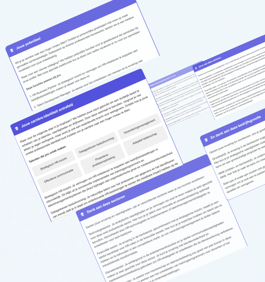 Het Job Trail carrière rapport onderscheidt zich door de combinatie van open vragen en geavanceerde AI-analyse. Geen standaard profielen, maar een écht persoonlijk inzicht in jouw carrièremogelijkheden.